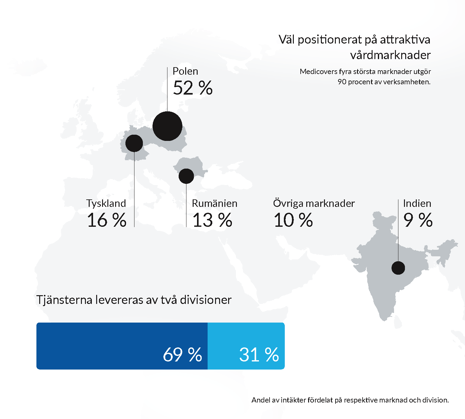 - Healthcare Services – erbjuder högkvalitativ vård baserad på en integrerad vårdmodell och kontantbetald vård. Vård erbjuds på 187 vårdkliniker, 41 sjukhus, 110 tandläkarkliniker, 18 fertilitetskliniker, 40 optik- butiker, 13 psykiatriska kliniker, 42 apotek och 176 gym. De största marknaderna är Polen, Indien och Rumänien.