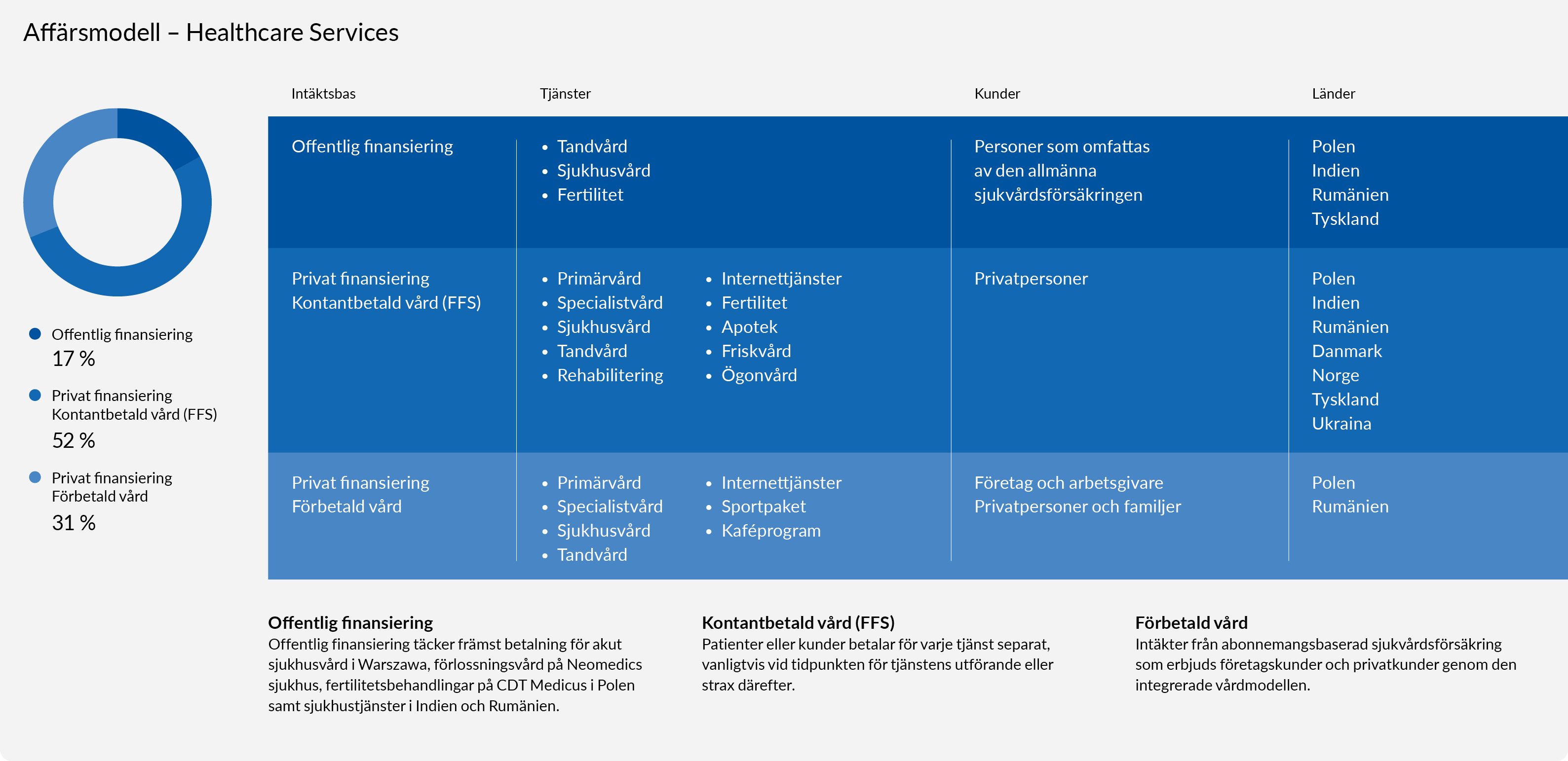 Healthcare Services har ett starkt erbjudande till både företags- (B2B) och privatkunder med ett holistiskt synsätt med fokus på prevention, och erbjuder högkvalitativ vård som bygger på den integrerade vårdmodellen och kontantbetald vård. Vi följer patienterna genom alla livets skeden, uppmuntrar till en hälsosam livsstil, håller människor friska från födseln och hjälper patienterna att hålla sig i form så länge som möjligt.